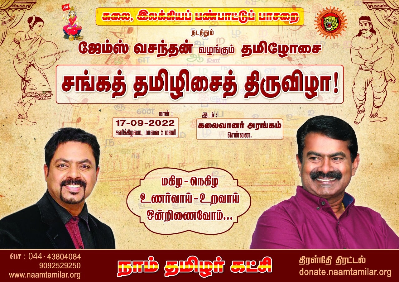 நாம் தமிழர் கட்சியின் கலை, இலக்கியப் பண்பாட்டுப் பாசறை நடத்தும் இசையமைப்பாளர் ஜேம்ஸ் வசந்தன் வழங்கும் தமிழோசை - சங்கத்தமிழ் இசைத் திருவிழா வரும் செப்டம்பர் மாதம் 17-ஆம் நாள் சனிக்கிழமை மாலை 5 மணிக்குச் சென்னை கலைவாணர் அரங்கில் நடைபெறுகிறது.